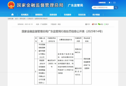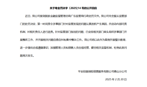 近日,平安创展保险销售服务有限公司佛山分公司对国家金融监督管理总局公布的《国家金融监督管理总局广东监管局行政处罚信息公开表(2025年14号)》进行了回应。该回应称:“我公司完全服从监管部门的处罚决定,第一时间责令涉事部门针对监管发现的问题认真剖析产生原因,并启动内部问责机制,对相关责任人进行追责。针对监管部门指出的问题,已安排相关部门牵头组织涉事部门开展整改工作,并开展相关问题自查自纠和集中整治工作。我公司将以此作为案例开展警示教育,进一步强化合规遵循意识,加强管理人员和销售人员合规经营,健全相关监督机制,杜绝此类问题再次发生。”